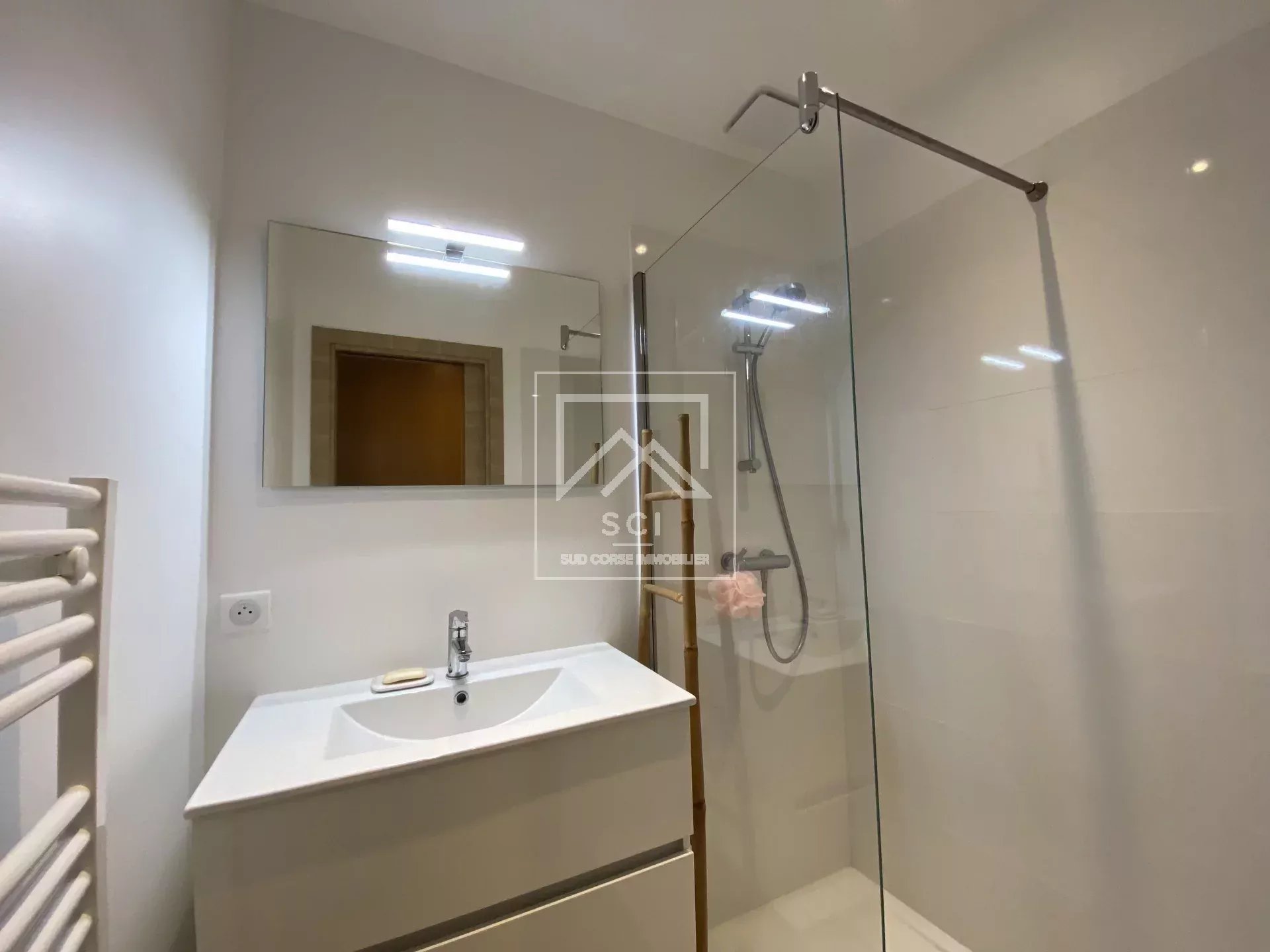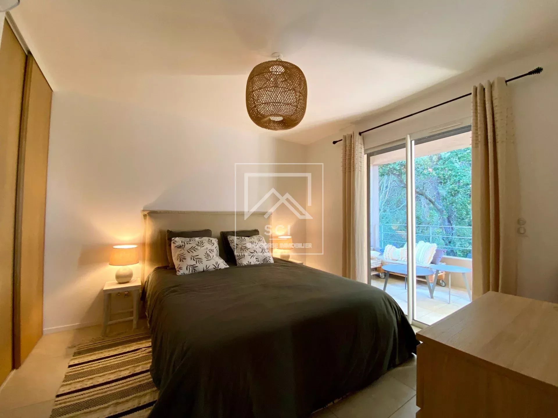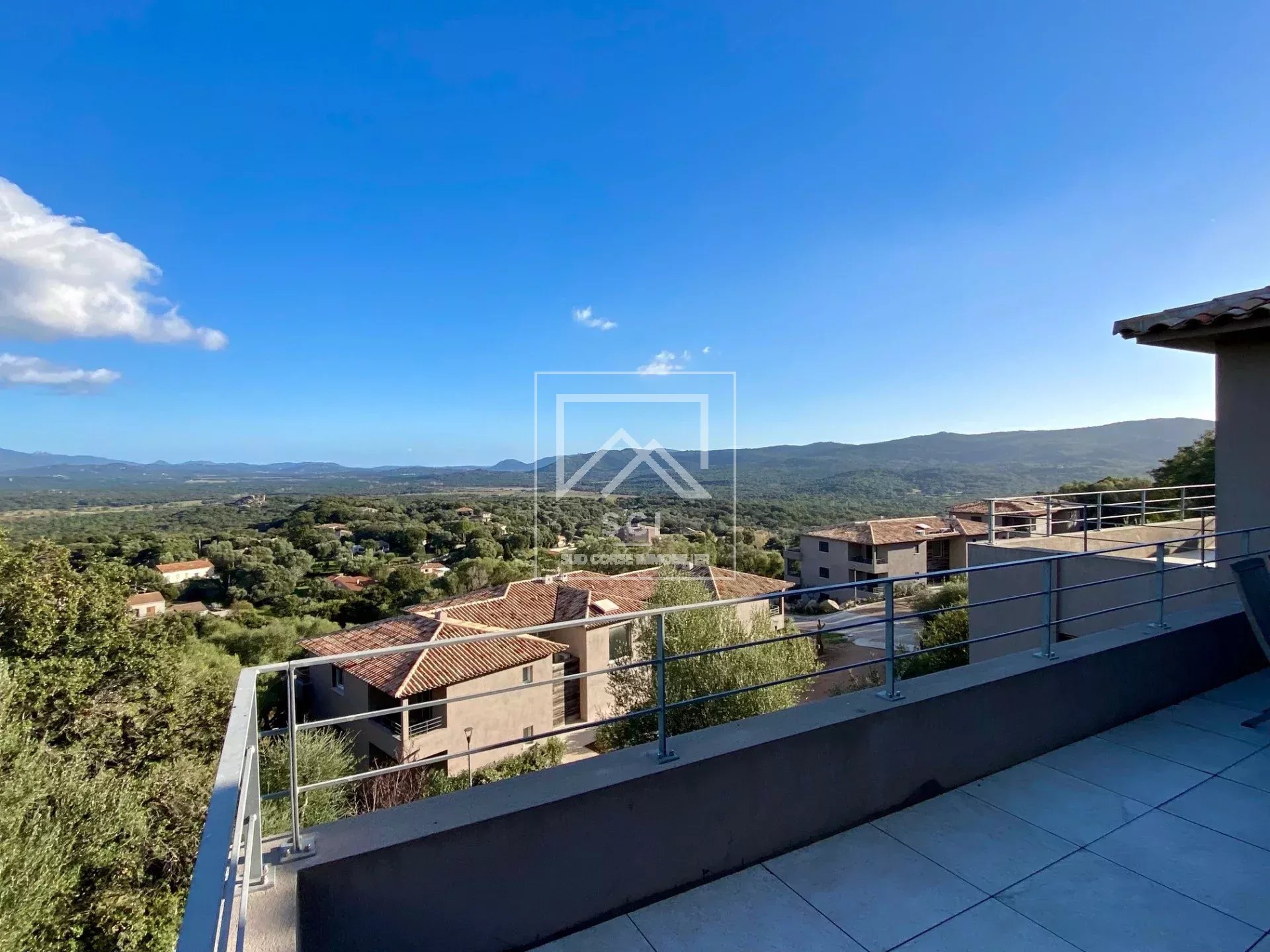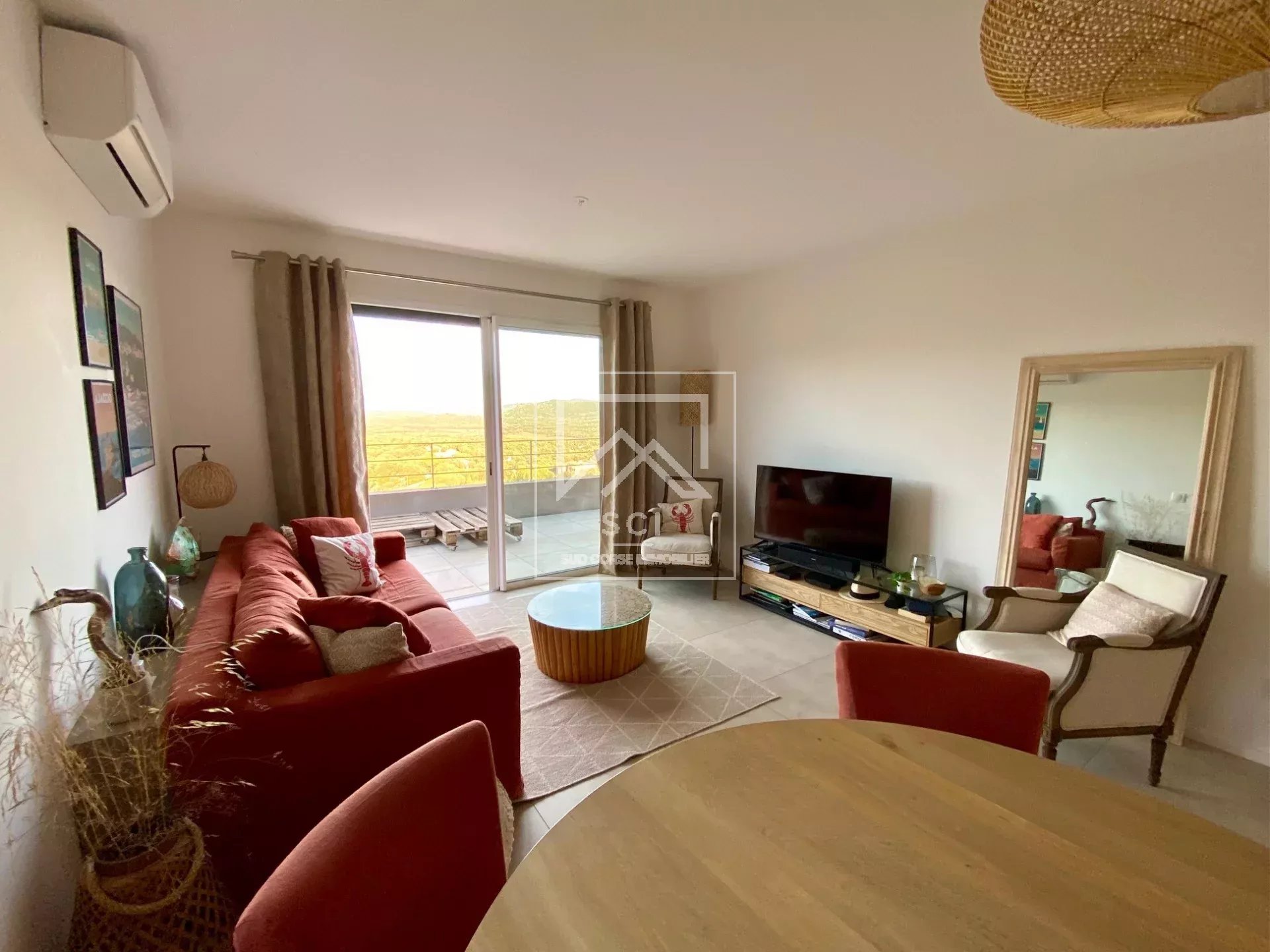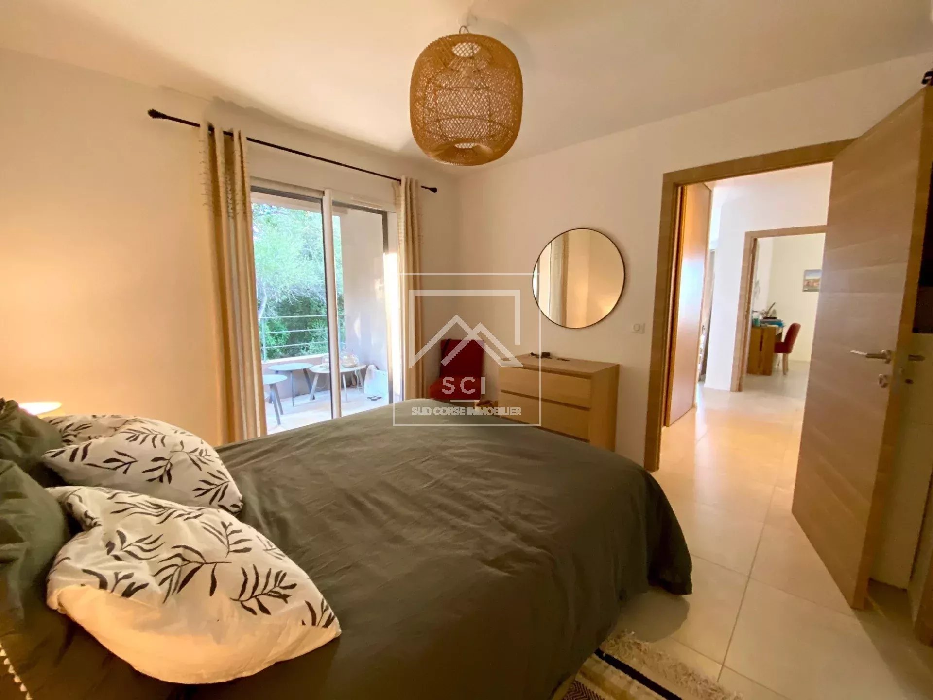 D'une surface habitable de 66 m², il se compose d'un séjour avec cuisine ouverte parfaitement équipée prolongé par une terrasse bénéficiant d'une belle vue sur les montagnes jusqu'au golfe de Porto-Vecchio puis deux chambres dont une avec salle d'eau/wc et terrasse privatives, une seconde salle d'eau et un wc indépendant.