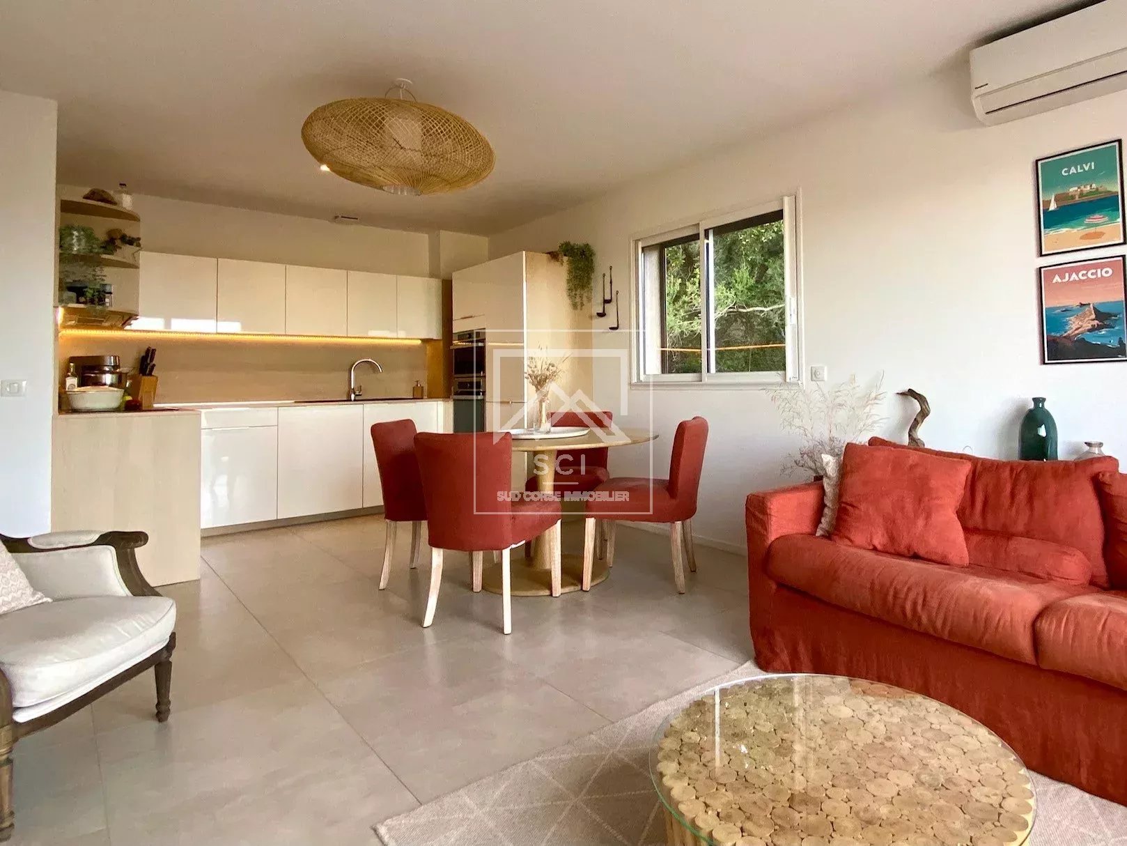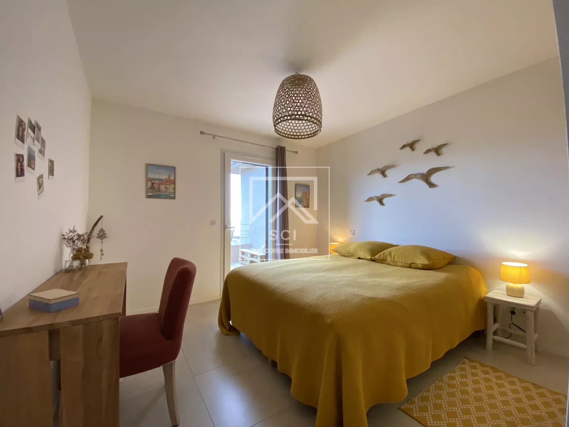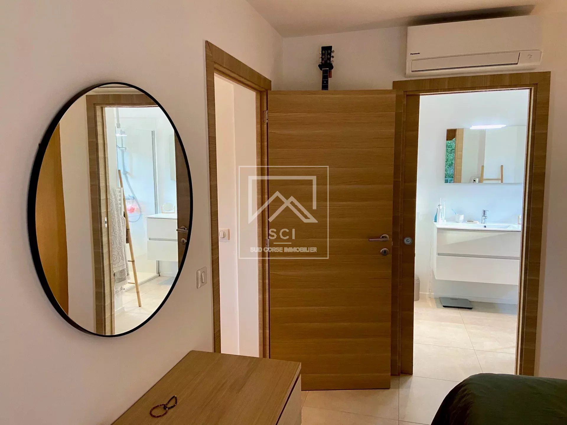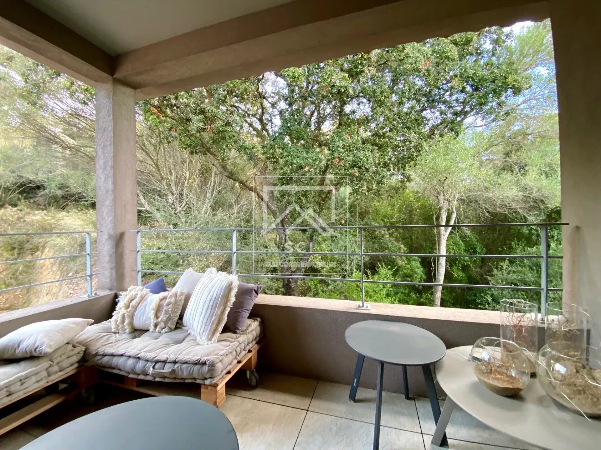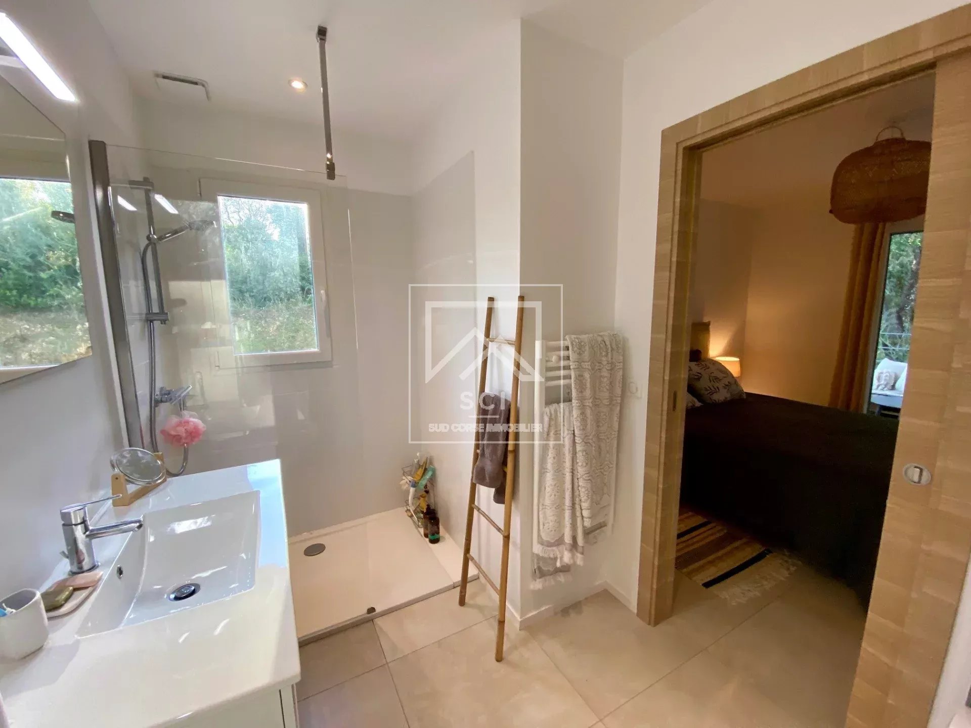 D'une surface habitable de 66 m², il se compose d'un séjour avec cuisine ouverte parfaitement équipée prolongé par une terrasse bénéficiant d'une belle vue sur les montagnes jusqu'au golfe de Porto-Vecchio puis deux chambres dont une avec salle d'eau/wc et terrasse privatives, une seconde salle d'eau et un wc indépendant.