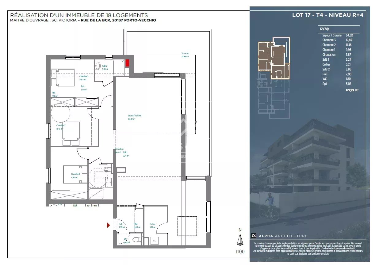 D'une surface habitable de 128 m², il comprend une entrée, un séjour avec cuisine ouverte prolongé par une terrasse de 35 m² avec vue sur le golfe de Porto-Vecchio puis 3 chambres dont une avec salle d'eau privative, une salle d'eau et un wc indépendant.