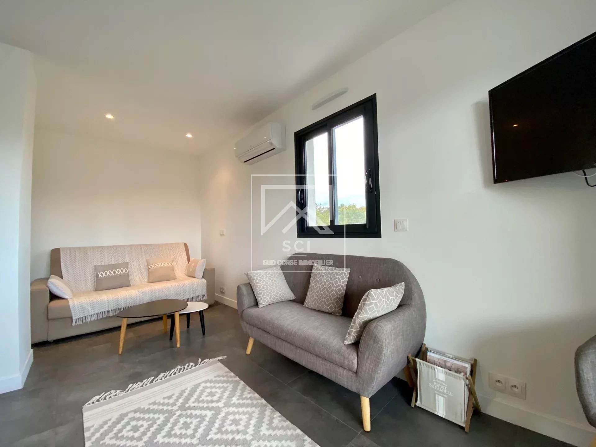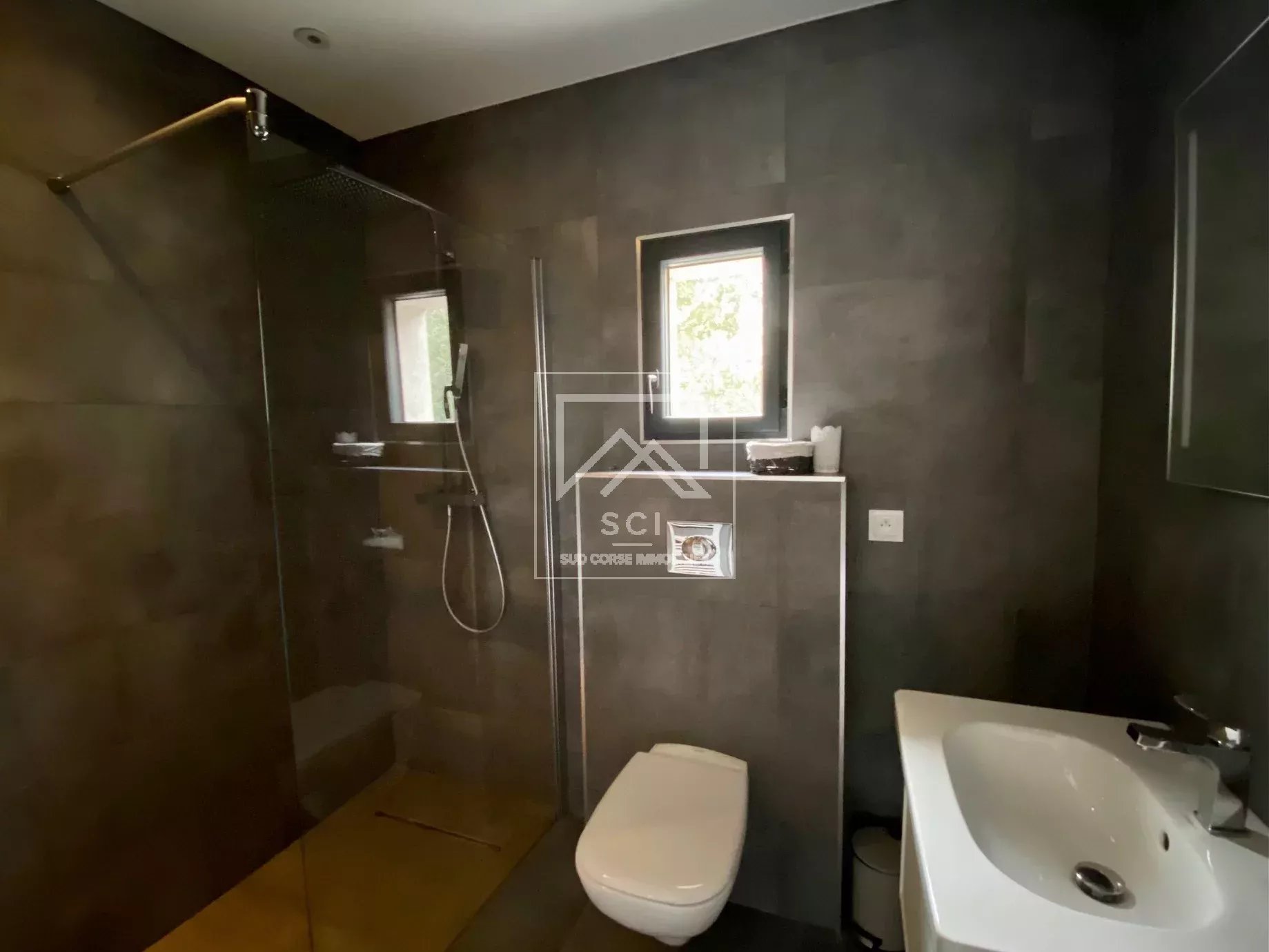 D'une surface habitable de 55 m² environ, il comprend une entrée, un séjour avec cuisine ouverte prolongé par une terrasse de 15 m² environ offrant une vue dégagée et un aperçu mer sur le golfe de Porto-Vecchio, une chambre avec salle d'eau privative avec wc, une seconde salle d'eau et un wc indépendant.
